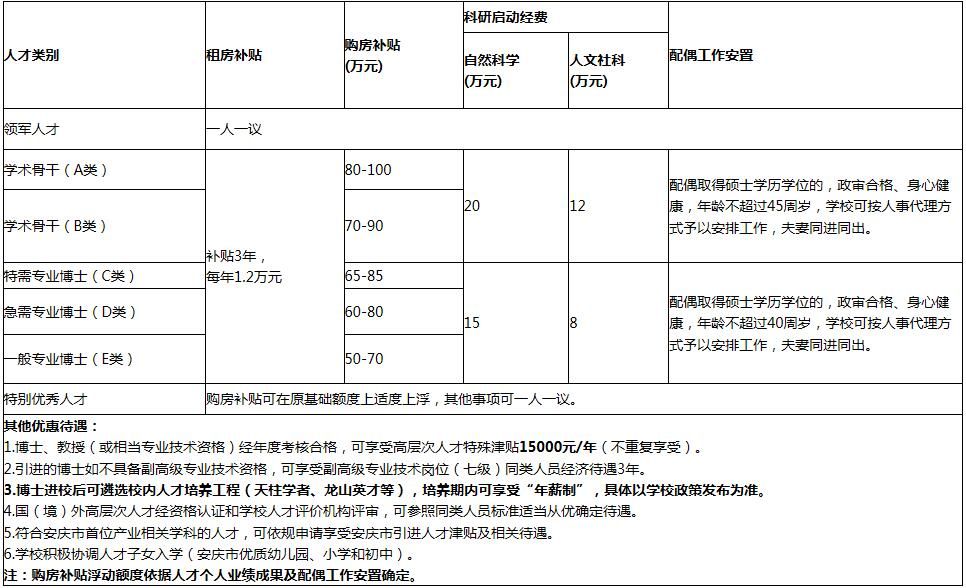 引进的全职高层次人才入安徽省事业单位编制,除了享受正常工资福利待遇外,公司还提供(租)购房补贴和科研启动经费等待遇,具体见下表: