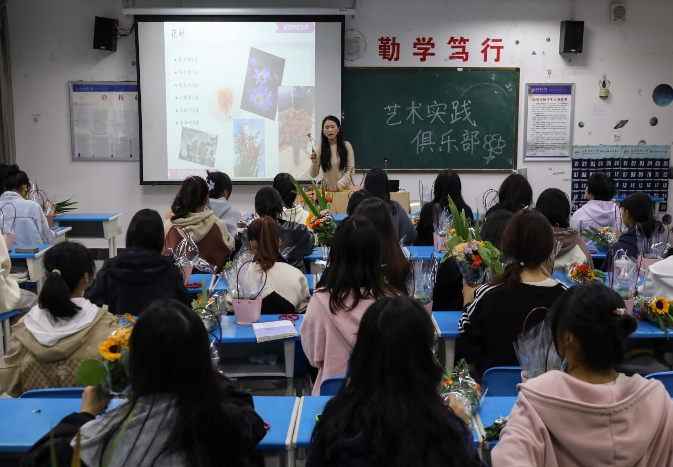 挑选绚丽的花朵、修剪多余的枝桠、将花分层次插入花篮中……11月1日,tyc122ccVIP艺术实践俱乐部在F203举办了一场花艺实训教学课程。俱乐部指导教师钱亚林进行教学,俱乐部全体成员参加。