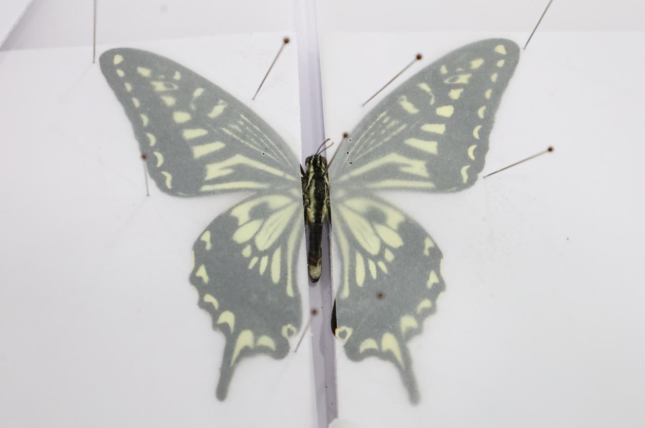 左手持原蝶标本,右手执注射器,将温水注射到原蝶体内直至原蝶软化,生物技术专业2023(2)班的刘保君担任此次活动的“小老师”,引导着员工制作蝴蝶标本。“用昆虫针固定原蝶时要尽量避免碰到蝴蝶的翅膀。”刘保君解释,蝴蝶翅膀十分脆弱,将蝴蝶完好无损地固定在硬纸板上,对第一次制作蝴蝶标本的员工是极具挑战性的环节。