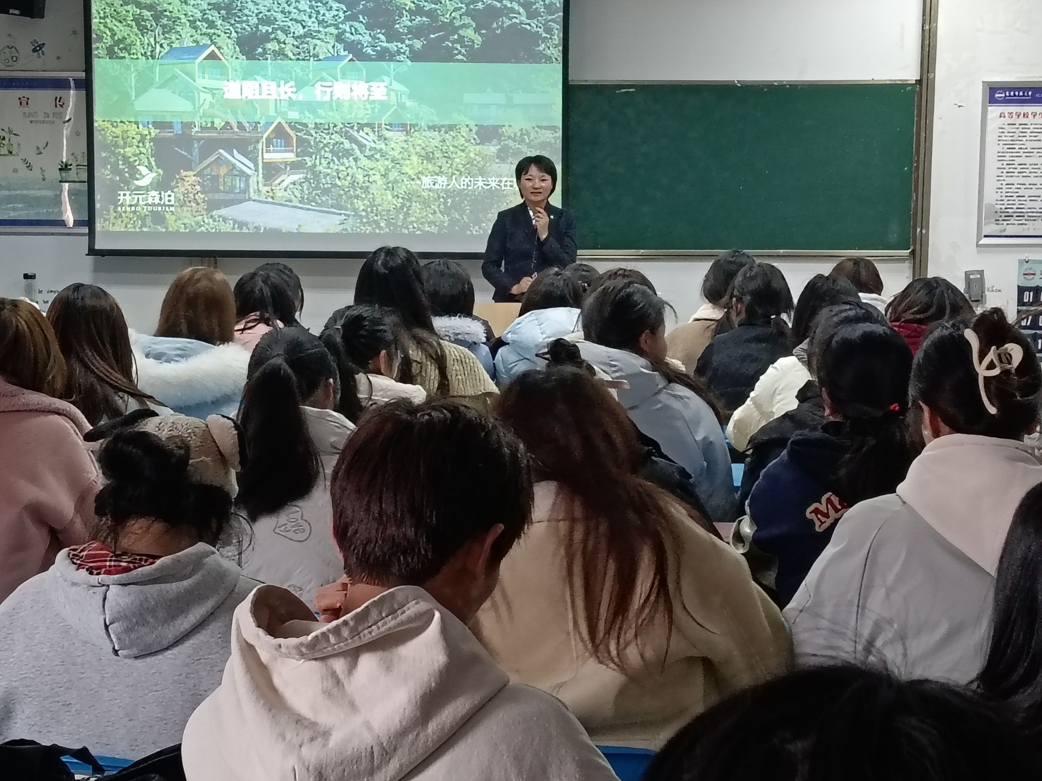 为助力广大学子明晰未来方向,汲取前行力量,近日tyc122ccVIP在F204教室开展优秀员工经验分享会,副经理朱磊主持会议。此次分享会特邀2018届旅游管理专业优秀毕业生,现任杭州开元森泊旅游投资有限公司人力资源经理吴燕女士担任主讲,以“道阻且长,行则将至—旅游人的未来在哪里”为主题,为2024级新生带来了一场精彩纷呈的成长导航课。