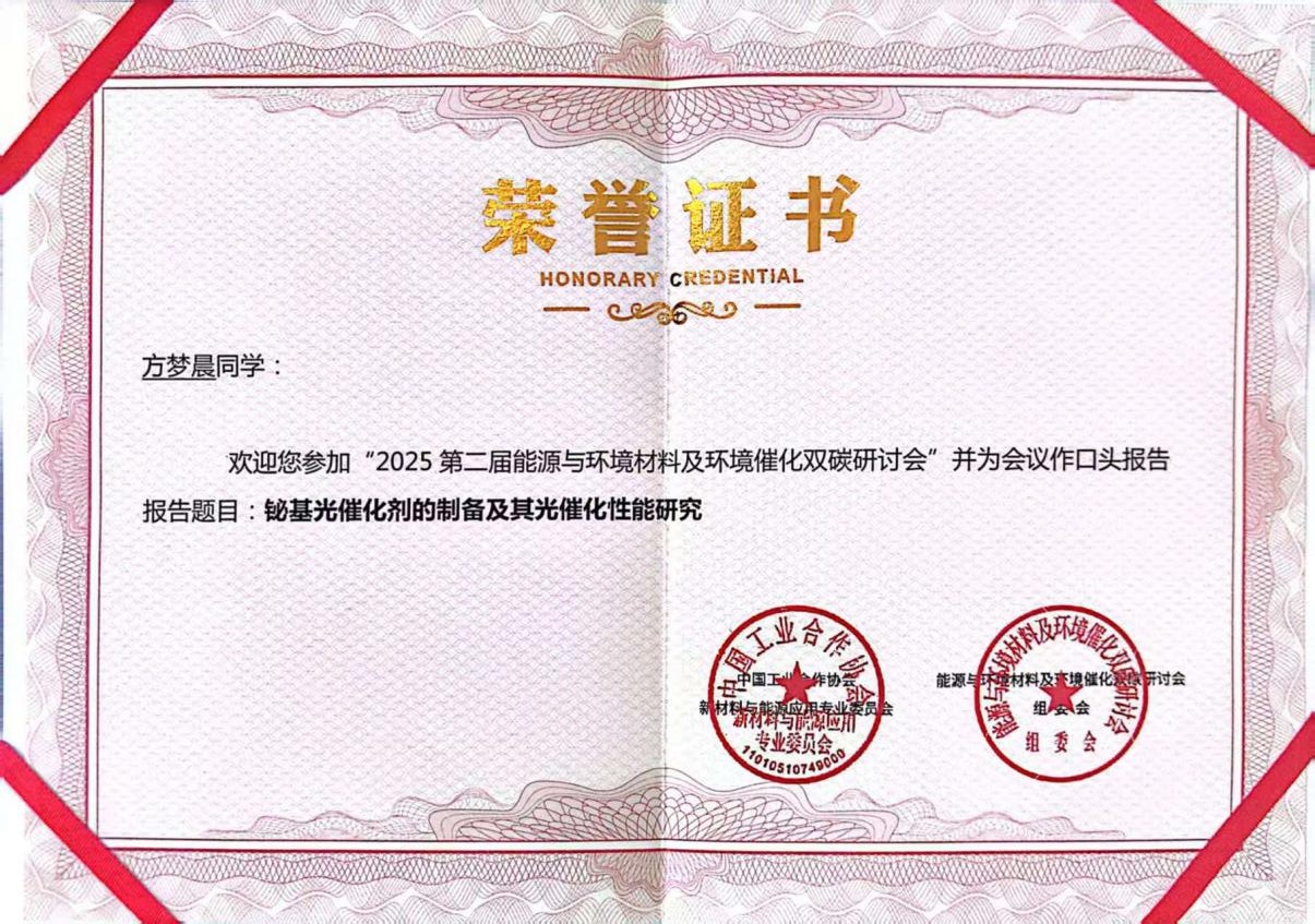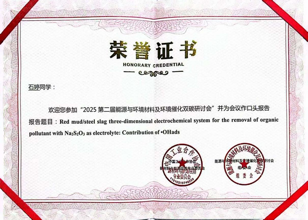 2025年8月11-13日,第七届全国有机光电功能材料与器件发展研讨会暨第二届能源与环境材料及环境催化双碳研讨会在河南洛阳成功召开。会议汇聚了国内相关领域的知名专家学者,围绕新型功能材料设计、能源转化与环境催化等前沿方向展开了深入交流。tyc122ccVIP环保高端装备与污染控制研究团队应邀参会,团队研究生石婷、刘鑫、方梦晨分别作学术报告,集中展示了团队在环境功能材料与污染控制领域的最新成果,获得了与会专家的广泛关注与高度评价。