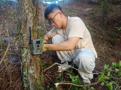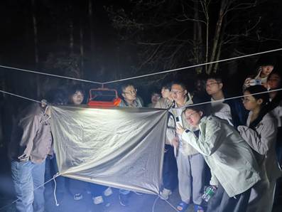 夜色渐渐来临,万安老师指导同学们学习如何使用红外相机、灯光诱捕、马氏网等方法进行动物调查。通过这些实操活动,同学们对天柱山生态系统有了更为整体、直观的认识。
