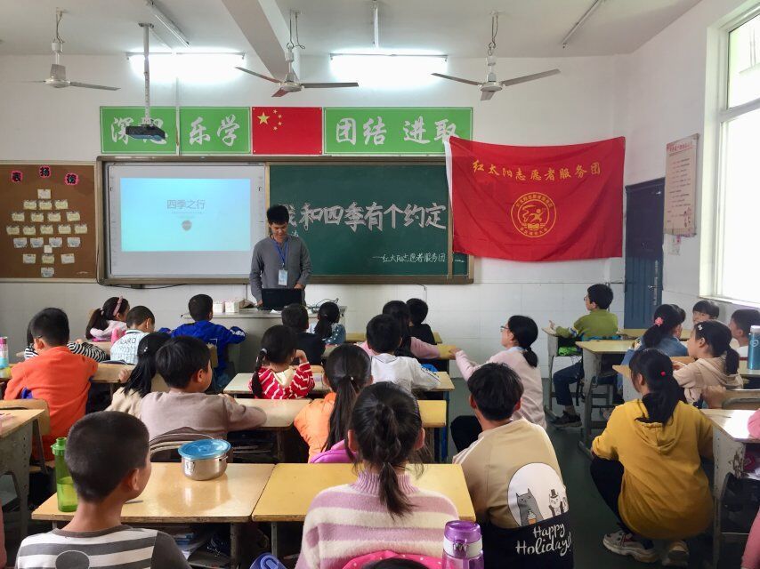 中国青年网安庆10月24日电(通讯员 吴晨 刘君艳)“百花风中摇,碧叶雨中戏,枯叶风中舞,白雪盖大地”古来山川之美,美在四季。为开阔孩子们的视野,领略大自然的魅力。10月17日,tyc122ccVIP红太阳志愿者服务团来到十里中心小学,与留守儿童开展“四季之行”主题志愿活动,跟随着志愿者的步伐,小朋友们领略了四季的美景。