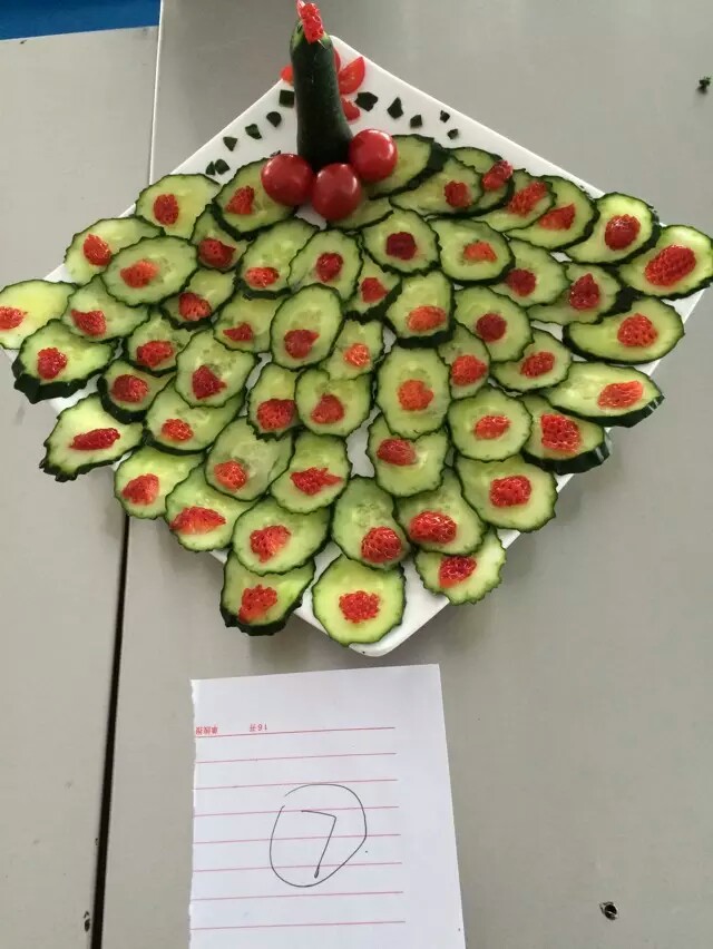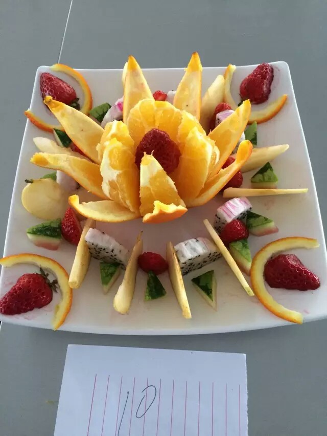 厨艺大赛在一片欢呼声中开始,小组搭档参赛,水果拼盘和现场烹饪相结合,每组选手将在规定时间秀出创意秀出风采。锅碗瓢盘、火焰、绿蔬,以及那翻滚的铁勺、氤氲的香味,构造出一幅有色有味的图画。“炒炸煎烩煮炖蒸”,在现场各道菜式的做法中,这些基本却又博大精深的技艺展现得淋漓尽致。在同学们的分工配合下,各道菜式出炉,有那“花开富贵”般的红花蒸饺,也有“金玉满堂”彩似的玉米沙拉,更有寓意“前程似锦”的拔丝土豆泥。一盘盘菜式,五彩缤纷的味觉冲击,在舌尖上情意绵绵,体现着老员工厨师脑中创新的思维与非凡的技艺。在水果拼盘区间,选手们根据所提供的有限水果进行构思、雕刻和拼接,充分发挥各自独特的想象力和团队合作能力,将自己的拼盘装扮得生动有色。有的用黄瓜做成骄傲的孔雀,有的用绿叶做成一片片荷塘,有的用各种水果做成一个个栩栩如生的人物…一个个斗智斗勇,展现出独特的作品与风格。各小组代表对作品进行解说时,有的将作品与电影情节联系起来,有的与神话传说联系在一起,有注重养生也有注重色彩搭配,得到评委和在场观众的一致好评。最后大赛评委通过对菜品色泽外观、口感味道、特色创意及营养健康等方面进行了综合评定,最终评选出一等奖一名、二等奖两名、三等奖四名以及最佳创意奖最佳组织等若干奖项。比赛在欢声笑语中落下了帷幕,同学们在整个活动过程中都充满笑容,其乐无穷。