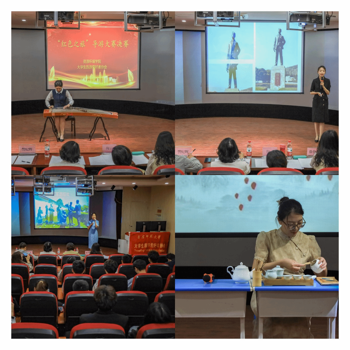 “同学们都多才多艺,十位选手竟有九种表演。”现场评委赞叹。在才艺展示环节,选手们大展身手,从声情并茂的诗歌朗诵到婉转悠扬的古筝弹奏,从传统的曲艺说书到新型的脱口秀,一场场精彩表演引得现场掌声不断。“导游证的有效期是几年?”“导游人员应如何处理交通事故?”“我国三大瀑布分别是哪些?”……在导游知识问答环节,选手们沉着应对、快速作答,展现出了较高的专业素养。