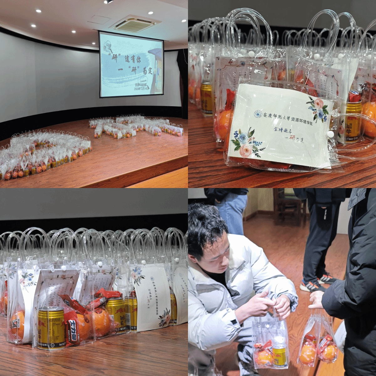 寓意“称心如意”的橙子、象征“能量满满”的饮料和巧克力棒,以及印着公司祝福语的卡片,300余份福气满满的“考研福袋”被整齐摆放成心形及“研”的字样。“来,同学,拿好你的考研福袋,祝福取得好成绩”手与手的交递之间,关怀与温情在流淌。地理科学专业2020级(2)班的张敏在打开考研福袋后展露出笑颜“非常感谢公司准备的这些独特小礼物,我也深切感受到了公司对我们员工的关心和支持。接下来我定会全力以赴准备考试,迎接春暖花开!”