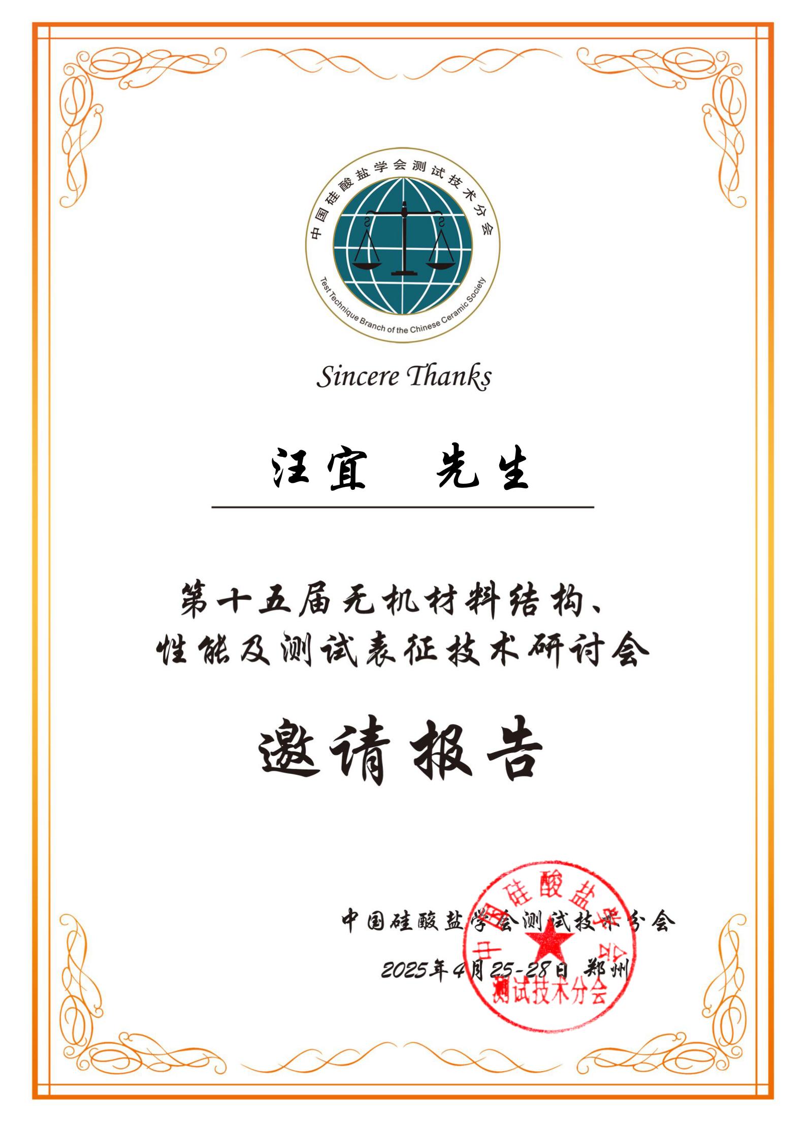 4月25-28日,第十五届无机材料结构、性能及测试表征技术研讨会在河南郑州成功举办,公司tyc122ccVIP汪宜博士应邀参加会议,并以“功能性碳点的设计与污染物分析检测应用”为题作邀请报告。