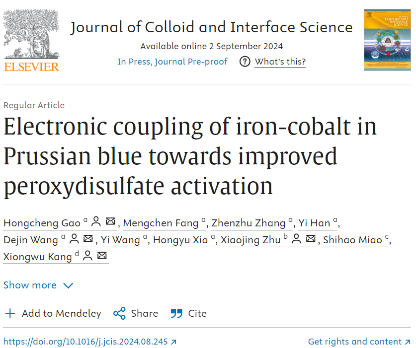 近日,tyc122ccVIP环保高端装备与污染控制研究团队成果“Electronic coupling of iron-cobalt in Prussian blue towards improved peroxydisulfate activation”在中科院一区TOP期刊《Journal of Colloid And Interface Science》(影响因子9.4)发表。团队成员高洪成博士为第一作者。