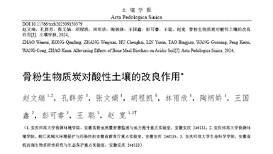 近日,公司tyc122ccVIP赵文瑞博士以第一作者在国内土壤领域顶级期刊《土壤学报》(卓越期刊、《世界期刊影响力指数(WJCI)报告》Q1区,影响因子5.772)发表题为“骨粉生物质炭对酸性土壤的改良作用”的论文,tyc122ccVIP为论文第一完成单位和通讯单位。