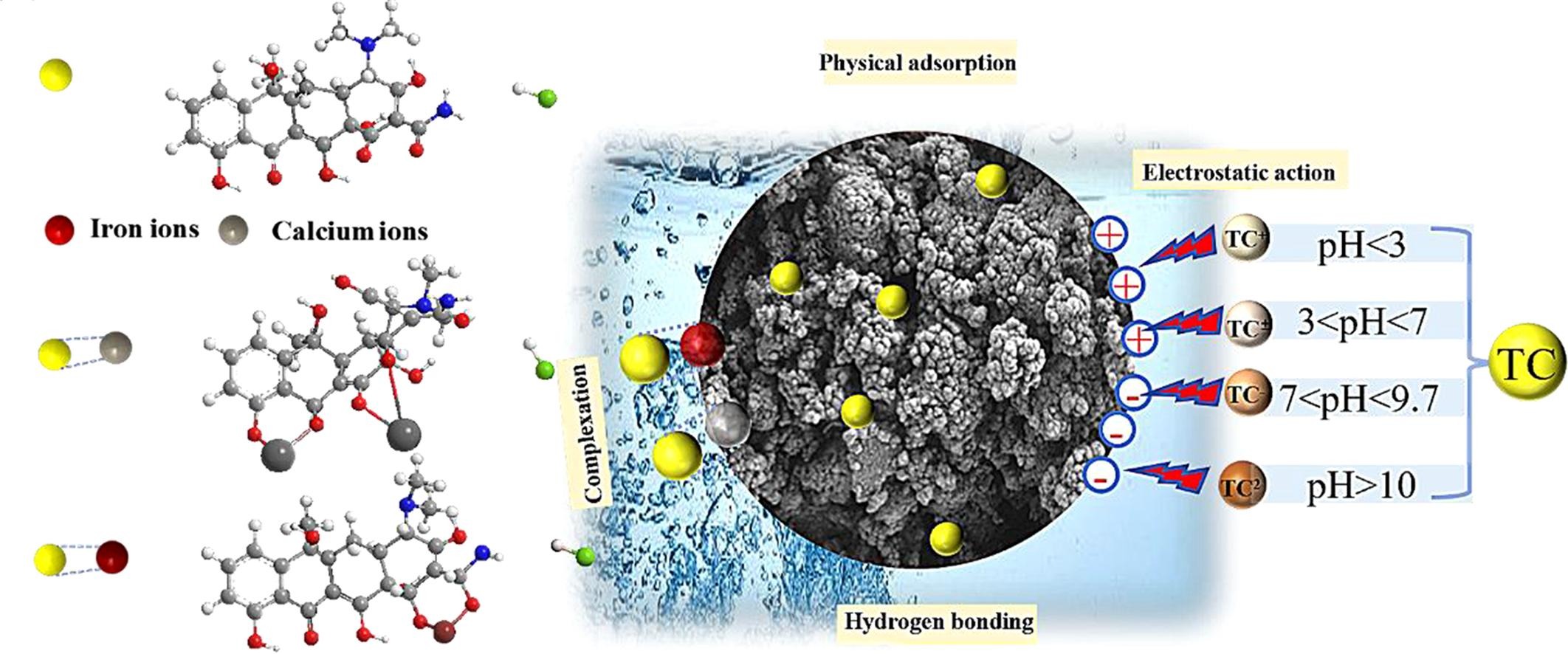 四环素作为常用抗生素,其过量使用导致的环境污染问题日益严峻。传统吸附剂成本高、回收难,难以大规模应用。在这项研究中,以工业固废赤泥和钢渣为原料通过高温煅烧成功制备了一种复合颗粒(RMSSx:y),最大吸附量达到183.78 mg/g。吸附过程涉及铁、钙与四环素的络合、氢键、静电作用和物理吸附等多种机制。此外,该复合颗粒具备磁响应特性和循环使用性能,可快速分离回收,避免了二次污染。(撰稿:韩毅 审核:汪德进)
