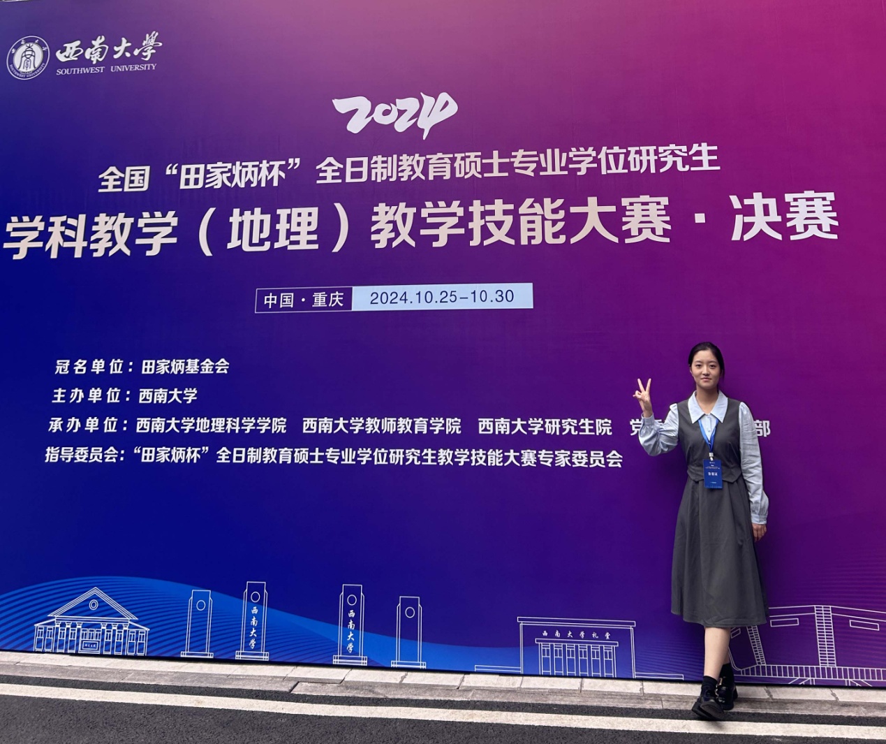 近日,全国“田家炳杯”全日制教育硕士学科教学(地理)专业教学技能大赛决赛在西南大学落下帷幕。tyc122ccVIP学科教学(地理)专业研究生余康正同学荣获二等奖,金宝石老师获优秀指导教师奖,这是本专业员工首次进入此项赛事决赛并取得佳绩。